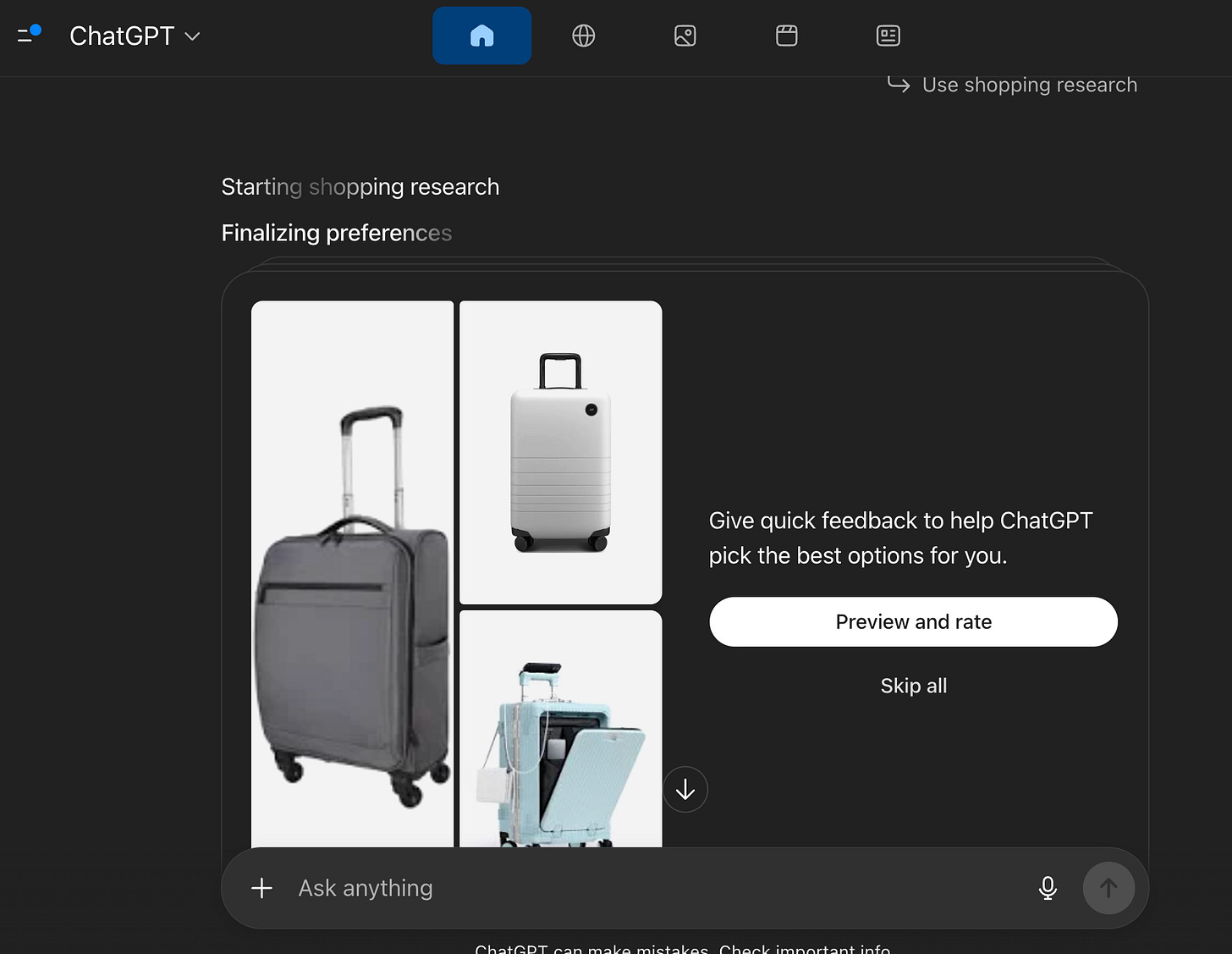 If you haven’t tried it yet, I urge you to do so. In a nutshell, you ask ChatGPT to perform research on a potential purchase. ChatGPT first asks if you want to use “shopping research.” If you say yes, it spends a few minutes asking about your preferences before launching into a search. In this moment, ChatGPT becomes an agent and starts the research process on your behalf.