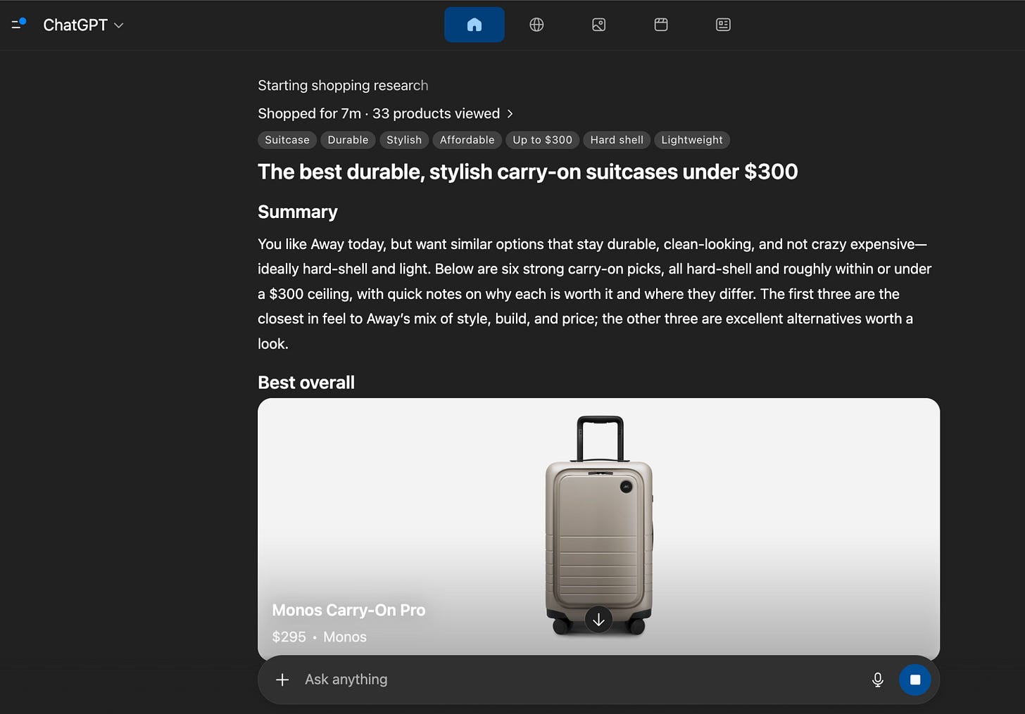 I tried it out for something that would actually be useful to me: suitcase research. I travel a lot. I bought my last suitcase almost a decade ago, and my current Away bag is showing signs of wear, so I thought ChatGPT could help me find reasonable alternatives to consider.